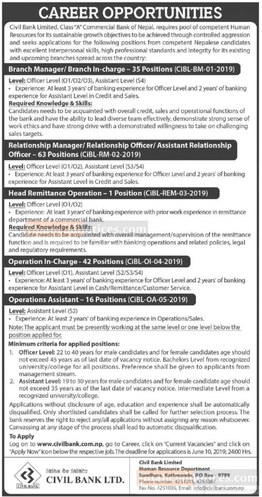 सिभिल बैंकले विभिन्न पदका लागि कर्मचारीको माग गरेको छ । बैंकले ब्रान्च म्यानेजर र ब्रान्च इन्चार्चका लागि ३५ जना, रिलेशनसिप म्यानेजर, रिलेशनसिप अफिसर,असिस्टेन्ट रिलेशनसिप अफिसरका लागि ६३ जना, हेड रेमिटेयान्सडिपार्टका लागि १ जना, अपरेशन इन्चार्चका लागि ४२ जना, अपरेशन असिस्टेन्टका लागि १६ जना गरी जम्मा १ सय ५७ जना कर्मचारीको माग गरेको हो ।