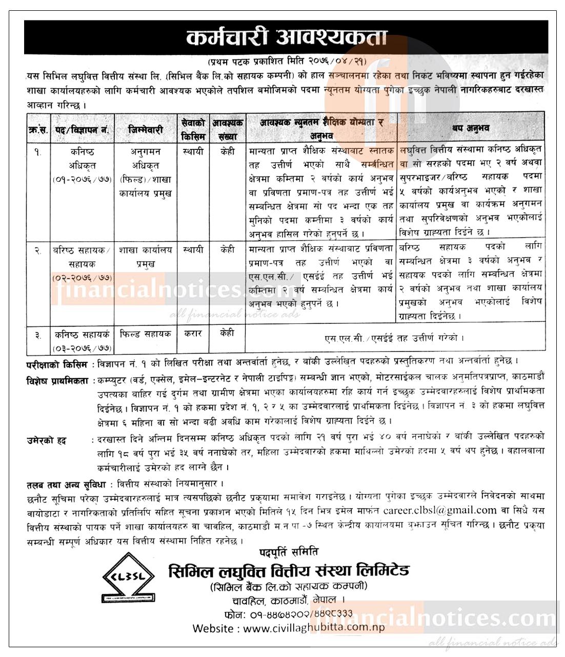 सिभिल लघुवित्त वित्तीय संस्थाले विभिन्न पदमा कर्मचरी माग गरेको छ । संस्थाले कनिष्ठ अधिकृत, वरिष्ठ सहायक सहायक र कनिष्ठ सहायक पदमा केही कर्मचारी माग गरेको हो ।