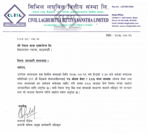 सिभिल लघुवित्त वित्तीय संस्थाले लाभांश दिने भएको छ । संस्थाले आफ्ना शेयरधनीहरु लाई ४ प्रतिशत बोनस र ३.५ प्रतिशत नगद गरि ७.५ प्रतिशत लाभांश दिने प्रस्ताव गरेको हो ।