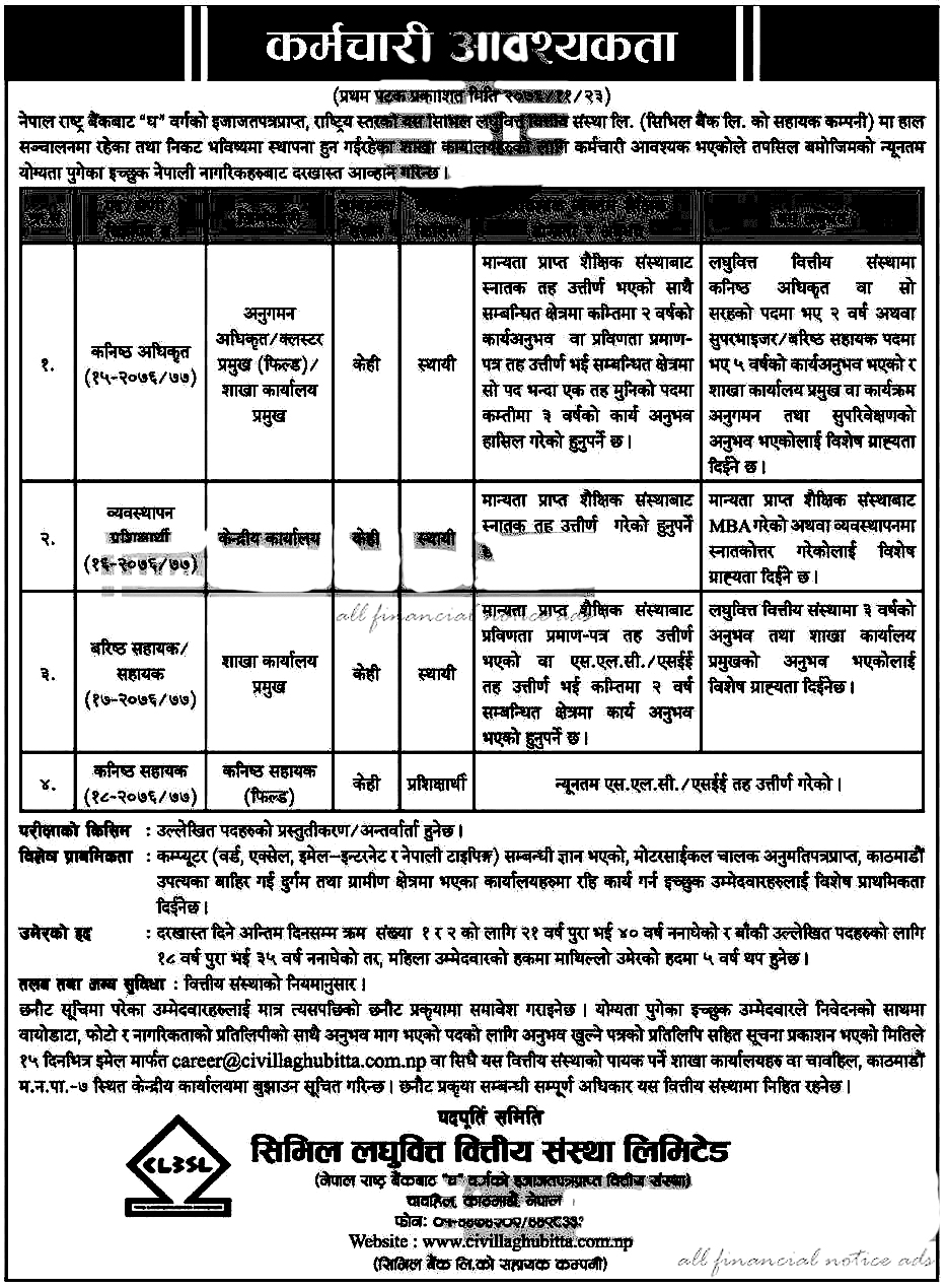 नियुक्ती स्थायी र प्रशिक्षार्थी हुने सो वित्तीय संस्थाले जनाएको छ । अनुगमन अधिकृत, फिल्ड प्रमुख, शाखा कार्यालय प्रमुख, केन्द्रीय कार्यालय र फिल्डमा काम गर्नको लागि कर्मचारी माग गरेको हो । फिल्डमा खटिने कनिष्ठ सहायकका लागि एसएलसी उत्तिर्णले आवेदन दिन पाउने छन् । त्यस्तै बरिष्ठ सहायक कार्यालय प्रमुखमा एसएलसी उत्तिर्ण गरी दुई वर्षको अनुभव तथा प्लस टु उत्तिर्णले आवेदन दिन पाउनेछन् ।