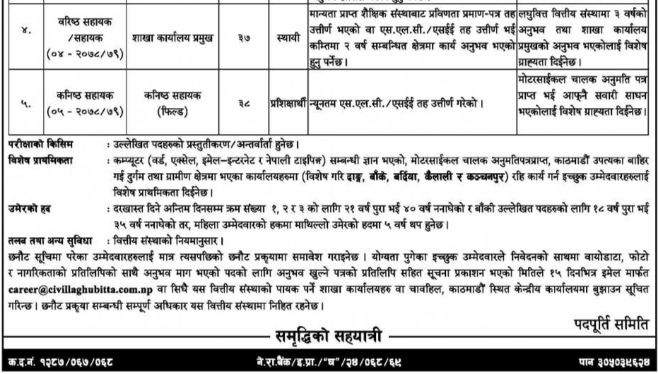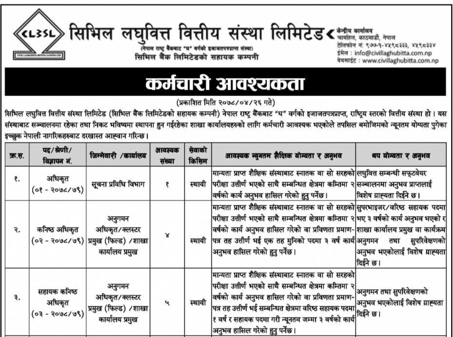 काठमाडौं । सिभिल लघुवित्तले विभिन्न पदका लागि कर्मचारीको माग गरेको छ । संस्थाले आफ्नो विभिन्न शाखा कार्यालयका लागि ८५ जना कर्मचारी माग गरेको छ जनाएको छ । कम्पनीले कनिष्ठ सहायकदेखि अधिकृत तहसम्मको लागि कर्मचारी माग गरेको हो ।