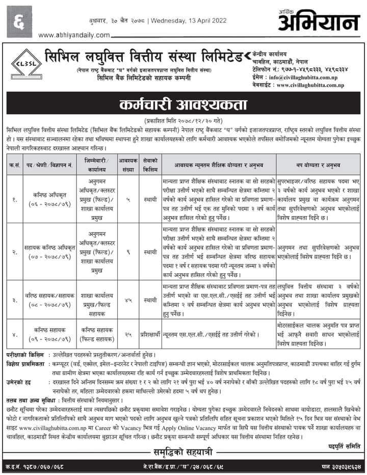 सिभिल लघुवित्तले माग्यो ८४ जना कर्मचारी, शैक्षिक योग्यता कति चाहिन्छ ?