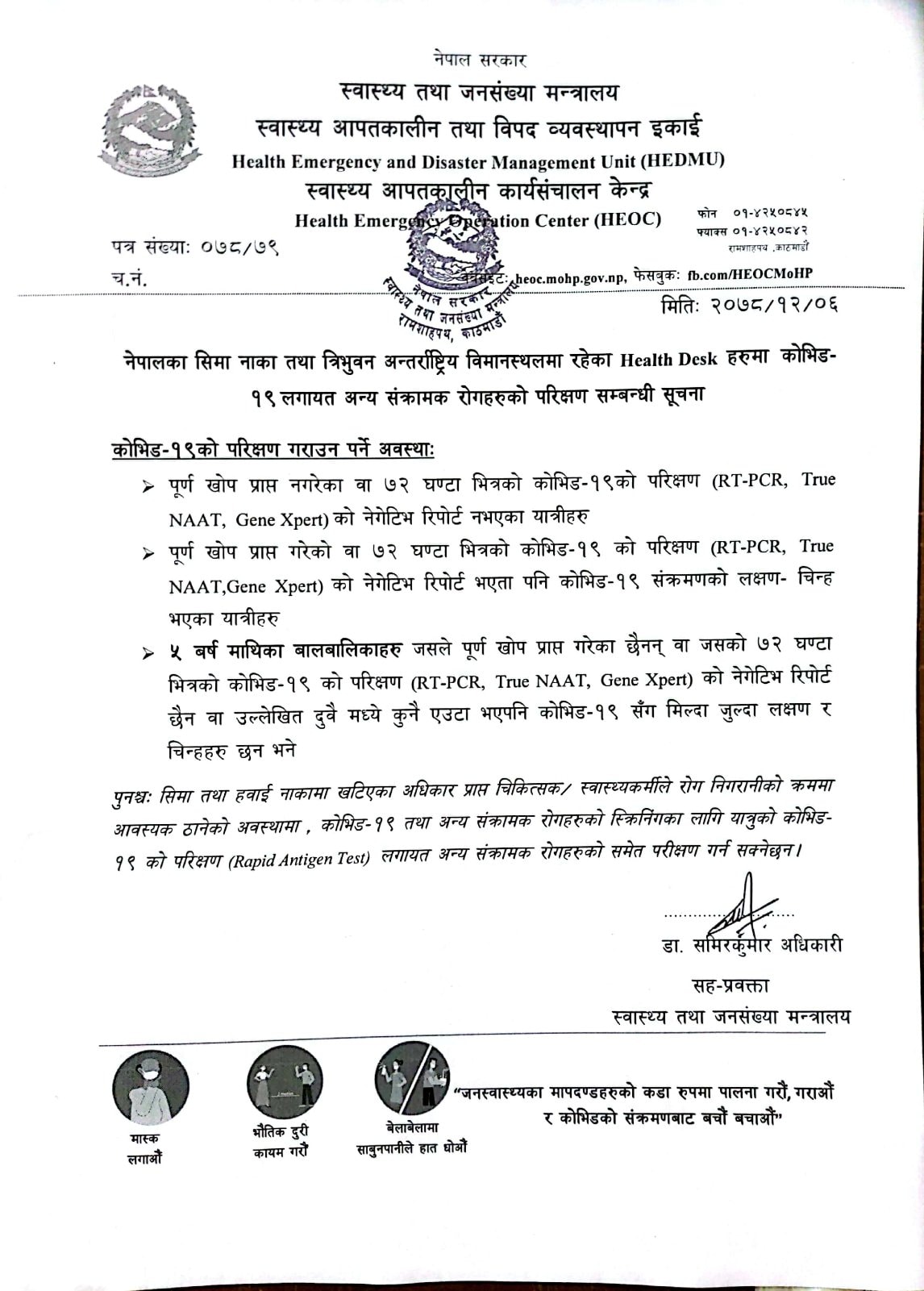 मन्त्रालयले पूर्ण खोप प्राप्त नगरेका वा ७२ घण्टा भित्रको कोभिड १९ को परिक्षणको नेगेटिभ रिपोर्ट नभएका यात्रीहरुले परिक्षण गर्नु पर्ने भएको छ । पूर्ण खोप प्राप्त गरेका वा ७२ घण्टा भित्रको कोभिड १९ को परीक्षणको नेगेटिभ रिपोर्ट भएता पनि कोभिड १९ सँग मिल्दा जुल्दा लक्षण र चिन्ह भएका यात्रीहरुको पनि अनिवार्य परिक्षण गर्नु पर्नेछ ।