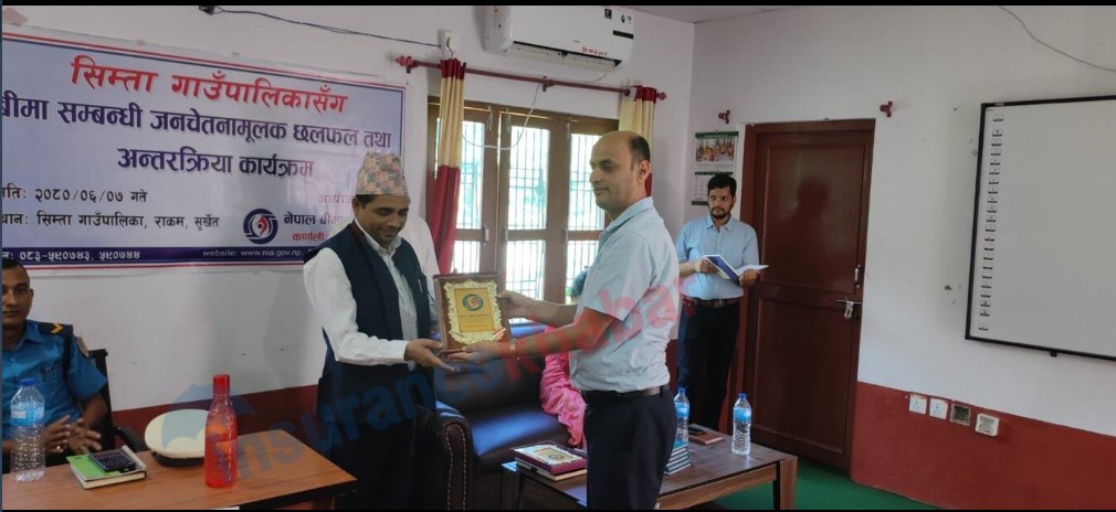 काठमाडौं । नेपाल बीमा प्राधिकरण कर्णाली प्रदेश कार्यालयले असोज ७ गते सिम्ता गाउँपालिका सुर्खेतमा बीमा सम्बन्धी अन्तरक्रिया कार्यक्रम सम्पन्न गरेको छ । प्राधिकरण कर्णाली प्रदेश कार्यालयले यस प्रदेशमा बीमाको विकास तथा पहुँच विस्तारको उद्देश्यले स्थानिय सरकारसँग बीमा सम्बन्धी छलफल तथा अन्तरक्रिया कार्यक्रम गर्दै आइरहेको छ । सोही क्रममा यस गाँउपालिकासँग उक्त कार्यक्रम आयोजना गरेको हो ।