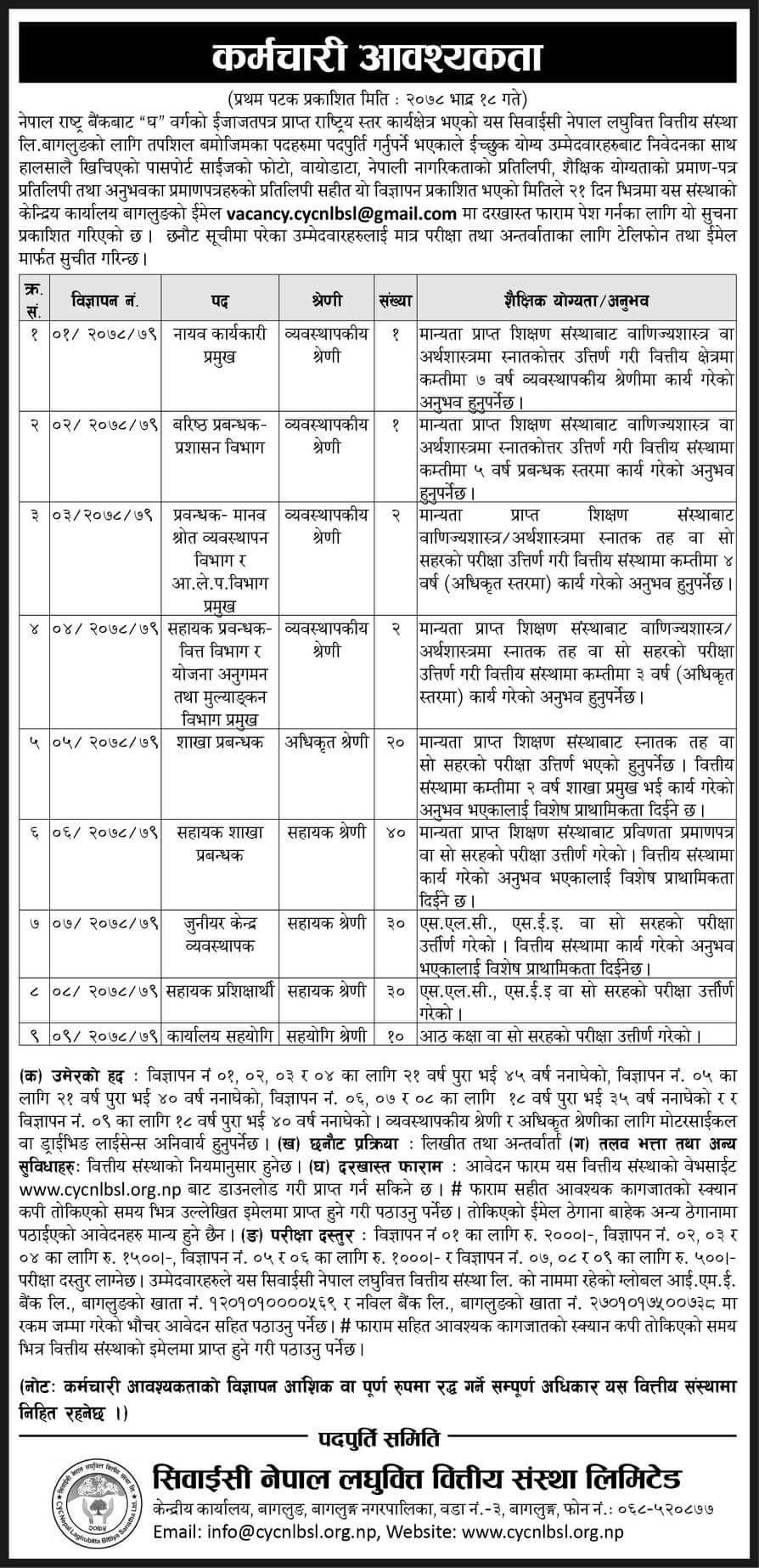 कम्पनीले आफ्नो भइरहेको विभिन्न शाखा कार्यालय तथा अब खोलिने विभिन्न नयाँ शाखा कार्यालयका लागि कर्मचारीको माग गरेको हो । ईच्छुक तथा योग्यता पुगेकाले सुचना प्रकाशित भएको मितिले २१ दिनभित्र आवेदन दिइसक्नुपर्नेछ ।