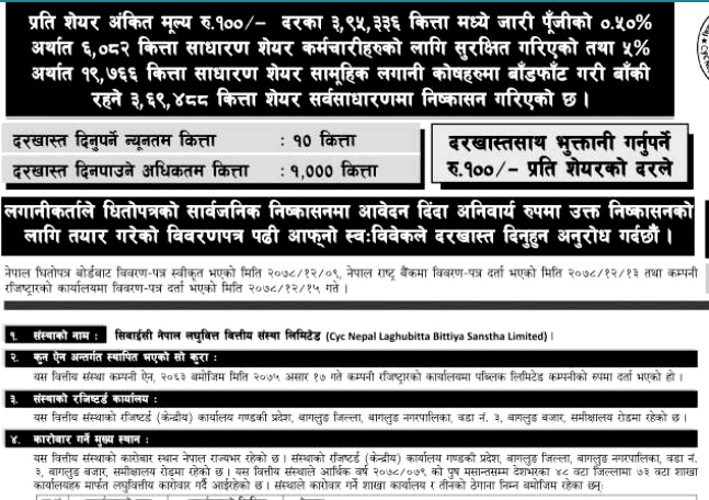काठमाडौं । सिवाईसी नेपाल लघुवित्त वित्तीय संस्थाले बैशाख २ गतेबाट सर्वसाधारणका लागि आइपीओ निष्काशन तथा विक्री खुला गर्ने भएको छ । कम्पनीले एक सय रुपैयाँ अंकित दरमा कम्पनीले ३ करोड ९५ लाख ३३ हजार ६ सय रुपैयाँ बराबरको ३ लाख ९५ हजार ३३६ कित्ता आइपीओ निष्काशन तथा विक्री गर्न लागेको हो ।