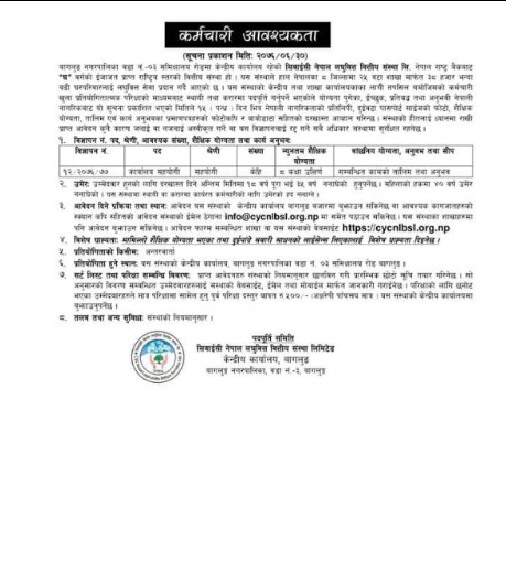 काठमाडौँ । सिवाईसी नेपाल लघुवित्त वित्तीय संस्था लिमिटेडले कर्मचरी माग गरेको छ । लघुवित्तले कार्यालय सहयोगी पदका लागि केही संख्यामा कर्मचारी माग गरेको हो ।