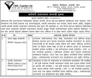 सिटिजन्स बैंक इन्टरनेशनल लिमिटेडको सहायक कम्पनी, सि बि आई एल क्यापिटलले विभिन्न पदका लागि कर्मचारीको माग गरेको छ । कम्पनीले नायब प्रमुख कार्यकारी अधिकृत र लगानि व्यवश्थापन अधिकृत पदका लागि कर्मचारीको माग गरेको हो ।