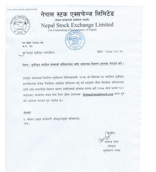 सूचीकृत कम्पनीहरुले साउन १७ गते कार्यलय समयभित्र आवश्यक विवरण इमेल ठेगाना [email protected] मा पठाउन आग्रह गरेको छ ।