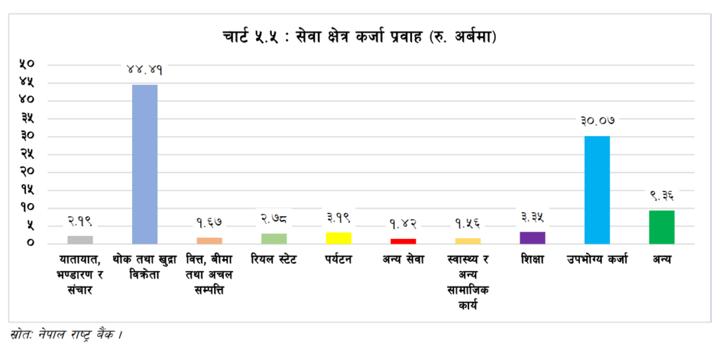 समीक्षा अवधिमा कुल सेवा क्षेत्र कर्जामध्ये थोक तथा खुद्रा विक्रेता सम्बन्धी व्यवसायमा ४४.४१ प्रतिशत, उपभोग्य कर्जामा ३०.०७ प्रतिशत, अन्य व्यवसायमा प्रवाहित कर्जा ९.३६ प्रतिशत, पर्यटनमा ३.१९, यातायात भण्डारण र संचारमा २.१९ प्रतिशत, वित्त, बीमा तथा अचल सम्पतिमा १.६७ प्रतिशत, शिक्षा क्षेत्रमा ३.३५ प्रतिशत, रियल स्टेटमा २.७८ प्रतिशत, अन्य सेवा व्यवसायमा १.४२ प्रतिशत र स्वास्थ्य र अन्य सामाजिक कार्यमा १.५६ प्रतिशत अंश रहेको छ ।