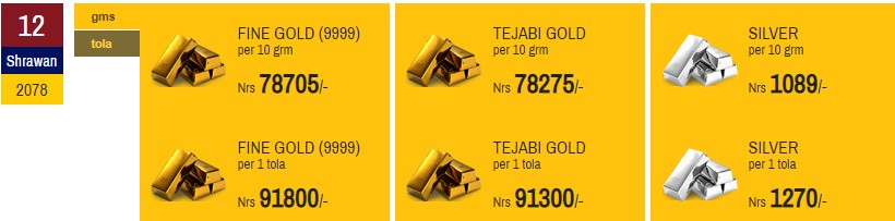 त्यस्तै तेजाबी सुनको भाउ ३ सय रुपैयाँले घटेर ९१ हजार ३ सय रुपैयाँ प्रतितोलामा कारोबार भइरहेको छ । आज चाँदीको भाउ भने स्थिर रहेको छ । १ हजार २ सय ७० रुपैयाँमा कारोबार भइरहेको नेपाल सुनचाँदी व्यवसायी महासंले जनाएको छ ।