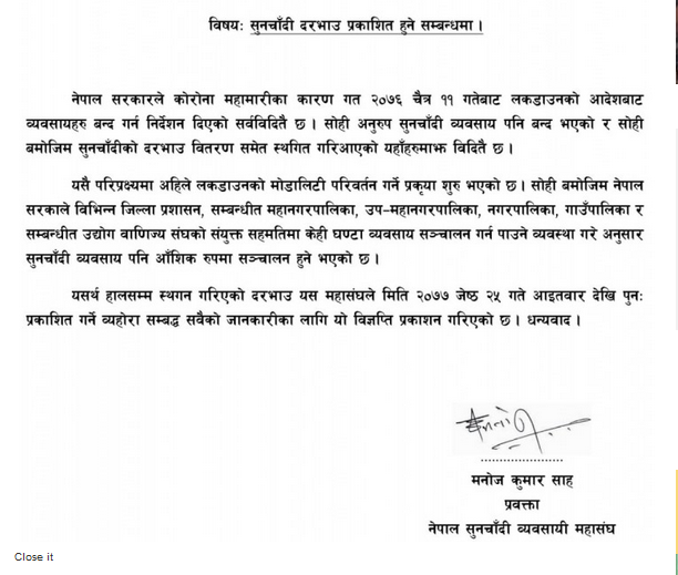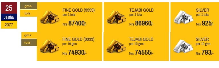 लकडाउनअघि चैत १० गते छापावाल सुनको मूल्य प्रतितोला ७७ हजार रुपैयाँ, तेजावी सुनको मूल्य ७६ हजार सात सय रुपैयाँ र चाँदीको मुल्य प्रतितोला ७२० रुपैयाँ निर्धारण गरिएको थियो।