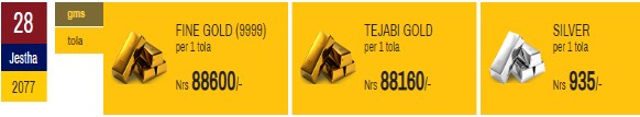 त्यस्तै, चाँदीको मूल्य भने प्रतितोला ५ सय रुपैयाँले बढेर ९ सय ३५ रुपैयाँ निधारण भएको छ।