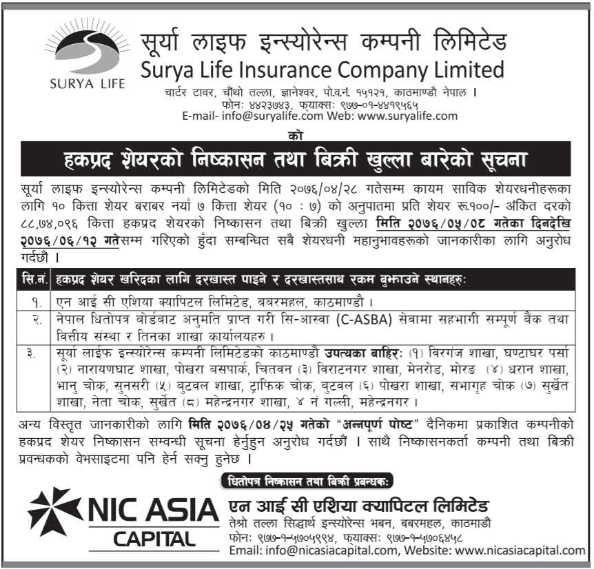 सुर्या लाइफको हकप्रद शेयरमा आवेदन दिनुभयो, कम्पनीले जारी गरेको सुचना यस्तो छ