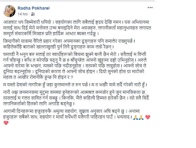 चार वर्षको लागि अध्यक्ष हुनु भएकी राधा पोखरेलले फेसबुक मार्फत सबैलाई धन्यवाद दिदै लगानिकर्ताको हितको लागि अगाडि बड्ने बताउनु भयो।