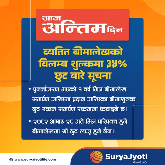 काठमाडौं । सूर्यज्योति लाइफ इन्स्योरेन्स व्यतित बीमालेख पुनर्जागरण गर्दा बीमितलाई लाग्ने ब्याजमा आज असार २८ गतेसम्म ३५ प्रतिशत छुट दिने घोषणा गरेको छ। यस कम्पनीबाट जारी गरिएका बीमालेखहरुमा आजसम्म पुनर्जागरण गराउने बीमितलाई लाग्ने ब्याजमा ३५ प्रतिशत छुट प्रदान गरिने जनाइएको छ।