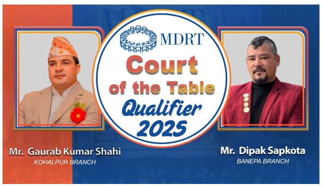 काठमाडौं। अभिकर्ताहरुको अन्तरराष्ट्रिय संस्था मिलियन डलर राउण्ड टेबल (एमडीआरटी) ले नेपालका लागी सन् २०२४ मा गरेको व्यवसायका आधारमा तोकिएको वार्षिक लक्ष्य पुरा गरी सूर्यज्योतिका ४० जना उत्कृष्ट अभिकर्ताहरु एमडीआरटी २०२५ को सदस्य बन्न सफल भएका छन। उक्त ४० जनामध्ये गौरव कुमार शाही र दिपक सापकोटा कोर्ट अफ द टेबल (सीओटी) का लागी योग्य भएका छन। गौरव कुमार शाही सीओटीमा दोस्रो पटक छनौट हुन सफल भएका हुन।