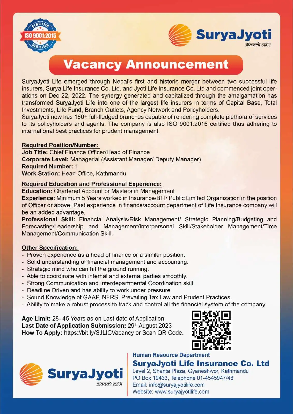 काठमाडौं । सूर्यज्योति लाइफले माग गरेको रोजगारीका लागि आवेदन दिने आज अन्तिम दिन रहेको छ । कम्पनीले चिफ फाइनान्स अफिसर रहेड अफ फाइनान्समा असिस्टेन्ट म्यानेजर डेपुटी म्यानेजरका लागि कर्मचारी माग गरेको हो । कम्पनीले आफ्नो केन्द्रीय कार्यालयका लागि कर्मचारी माग गरेको हो । चार्टर्ड एकाउन्टेन्ट वा व्यवस्थापन संकायमा स्नाकोत्तर गरेको हुनुपर्नेछ । कम्तिमा पनि सम्बन्धीत क्षेत्रमा ५ वर्षको अनुभव भएको हुनुपर्ने कम्पनीले जनाएको छ । २८ वर्ष पुरा भई ४५ वर्ष ननाघेको हुनुपर्ने कम्पनीले बताएको छ ।