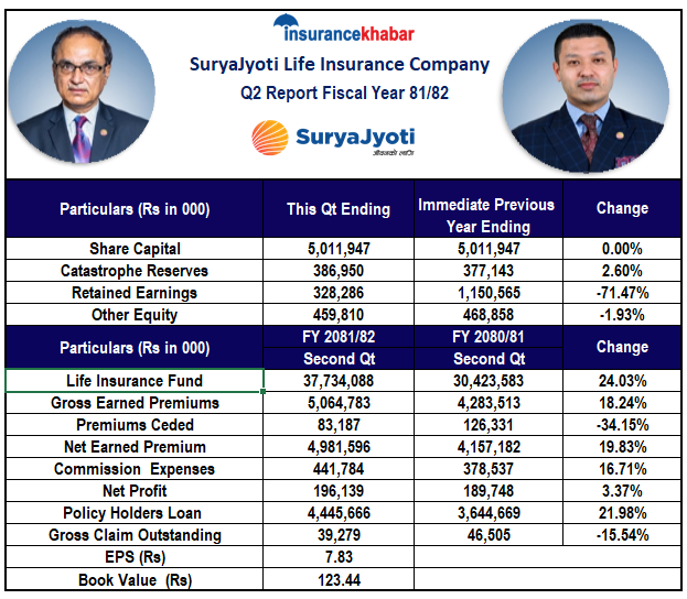 काठमाडौं । सूर्यज्योति लाइफ इन्स्योरेन्स चालु आर्थिक वर्षको दोस्रो त्रैमास (साउन–पुस)सम्मको अपरिष्कृत वित्तीय विवरण सार्वजनिक गरेको छ।