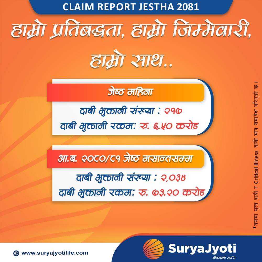 त्यस्तै, कम्पनीले चालु आर्थिक वर्ष २०८०/८१ को जेठ मसान्तसम्ममा २ हजार ३४ वटा दाबीबापत ७३ करोड २० लाख रुपैयाँ दाबी भुक्तानी गरेको छ ।