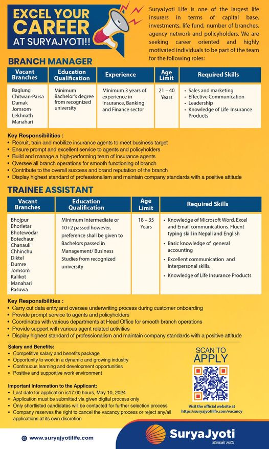 काठमाडौं । सूर्यज्योति लाइफले दुई पदका लागि कर्मचारी माग गरेको छ । कम्पनीले ६ शाखा कार्यालयका लागि ब्रान्च म्यानेजर माग गरेको छ । त्यस्तै, १२ शाखा कार्यालयका लागि ट्रेनी असिस्टेन्टका लागि कर्मचारी माग गरेको छ । उक्त पदहरुमा काम गर्नका लागि सम्बन्धीत क्षेत्रमा काम गरेको अनुभव हुनुपर्ने जनाएको छ ।