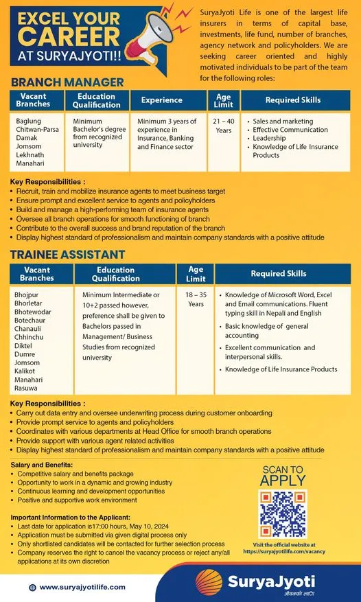 सूर्यज्योति लाइफले माग्यो १८ शाखाका लागि कर्मचारी, आवेदन दिने आज अन्तिम दिन