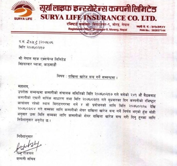सूर्या लाइफ इन्स्योरेन्सले आर्थिक वर्ष २०७४/०७५ को मुनाफाबाट शेयरधनीलाई प्रस्ताव गरेको बोनस शेयर वितरण तथा साधारण सभा प्रयोजनाका लागि जेठ २८ गतेदेखि असार ४ गतेसम्म बुक क्लोज गर्ने निर्णय गरेको छ । त्यसकारण जेठ २७ गतेसम्म कायम शेयरधनीले मात्र सभामा सहभागी हुन पाउने छन् ।