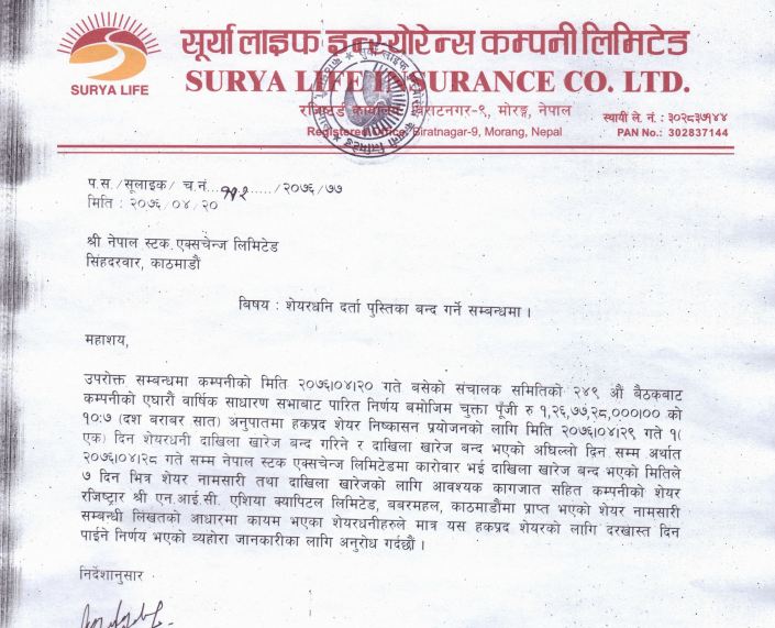 काठमाडौं । सूर्या लाइफ इन्स्योरेन्सले ७० प्रतिशत हकप्रद शेयर बिक्री गनका लार्गि बुधबार (साउन २९ गते) बुक क्लोज गर्ने भएको छ । त्यसकारण मंगलबार (साउन २८ गते) सम्म कायम रहने शेयरधनी मात्र हकप्रद शेयर भर्न सने छन् ।