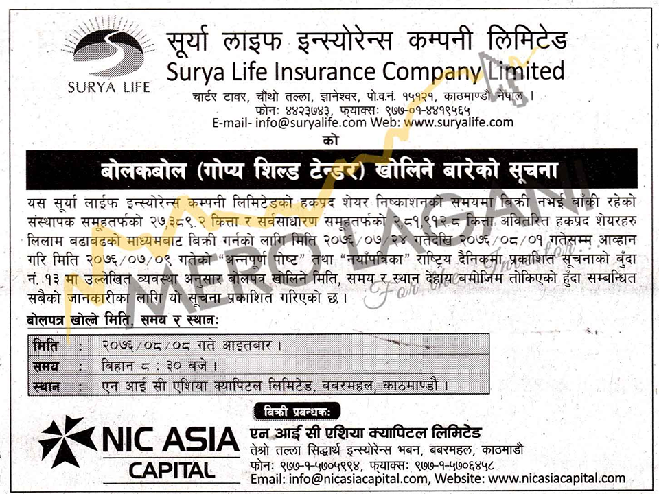 हकप्रद शेयर मंसिर ८ गतेदेखि खुल्ने कम्पनीले जनाएको छ । लिलाम कम्पनीको विक्रि प्रबन्धक एनआइसी एशिया क्यापिटल लिमिटेडमा खुल्ने सूर्या लाईफ इन्स्योरेन्सले जनाएको छ ।