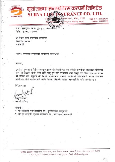 काठमाडौं । सूर्या लाइफ इन्स्योरेन्स कम्पनीकोे संचालकमा विवेक झा नियुक्त भएका छन् । कम्पनीको जेठ ७ गते बिहान ११ बजे बसेको २९१ औ संचालक समितिको बैठकले झालाई संस्थापक तर्फ रिक्त संचालक पदमा नियुक्त गरेको हो ।