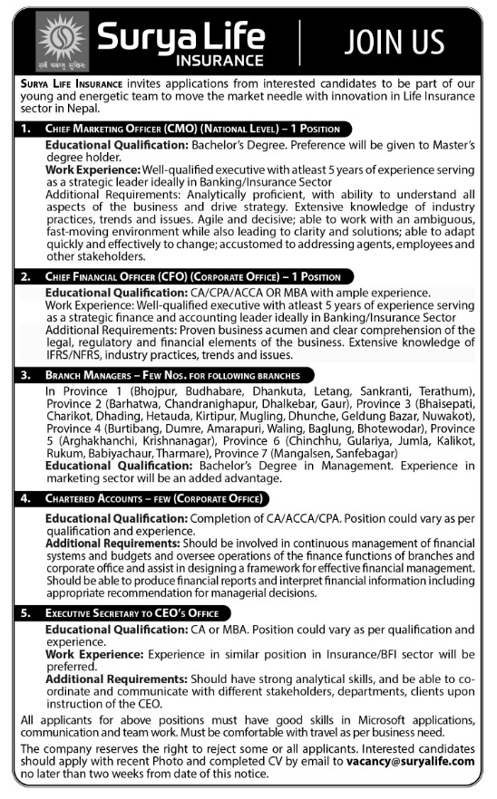 यी विभिन्न पदका लागि शैक्षिक योग्यता स्नातकोत्तर उत्तिर्ण देखि सिए र एमबिएमा उत्तिर्ण गरेको तथा इन्स्योरेन्स क्षेत्रमा अनुभव भएको कर्मचारी मागेको हो । ईच्छुक तथा योग्यता पुगेकाले आवश्यक कागजात संकलन गरी सुचना प्रकाशित भएको मितिले दुई हप्ता भित्र कम्पनीमा पठाउन आग्रह गरेको छ ।