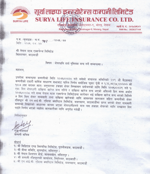 सूर्या लाइफ इन्स्योरेन्सले हकप्रद प्रयोजनको लागि तोक्यो बुक क्लोज मिति