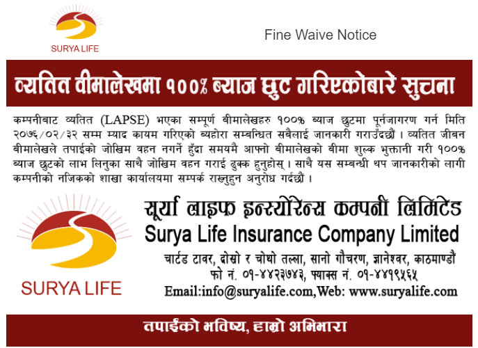 सूर्या लाईफ इन्स्योरेन्स कम्पनीले बीमितहरुलाई बीमालेख नबिकरण गर्न छुटेकोहरुलाई जेठ ३२ गते सम्ममा ब्यतित बीमा पुनर्जागरणमा ब्याज छुट प्रदान गरेको छ ।