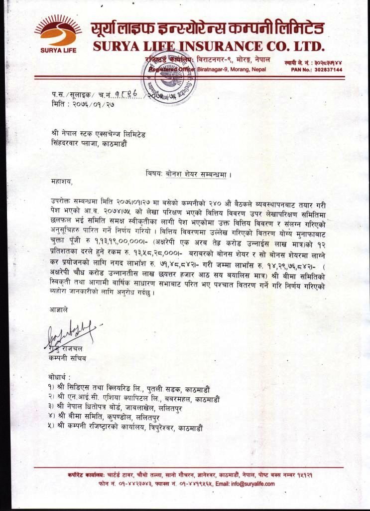 सूर्या लाईफ इन्स्योरेन्स कम्पनीले आर्थिक वर्ष २०७४/७५ को मुनाफाबाट शेयरधनीलाई चुक्ता पूँजीको १२ प्रतिशत बोनस शेयर वितरण गर्ने भएको छ ।