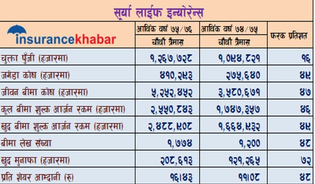 काठमाडौं । सूर्या लाईफ इन्स्योरेन्सले आर्थिक वर्ष ०७५।७६ को चौथौ त्रैमासको वित्तिय विवरण सार्वजनिक गरेको छ ।