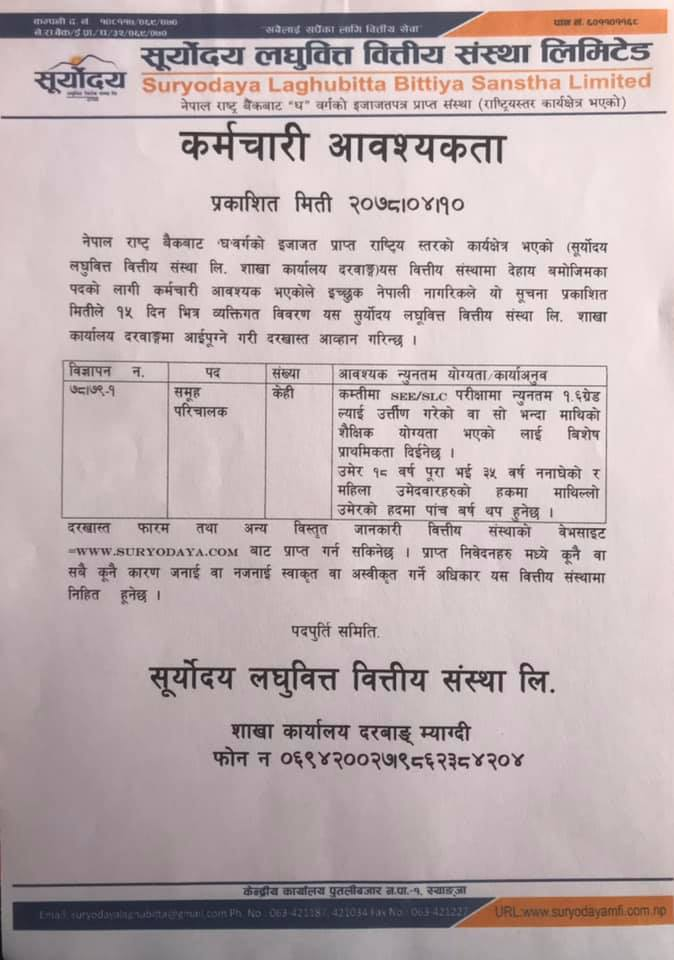 काठमाडौं । सूर्योदय लघुवित्त वित्तीय संस्थाले कर्मचारीको माग गरेको छ । संस्थाले समुह परिचालकका लागि केही संख्यामा कर्मचारीको माग गरेको हो । संस्थाले आफ्नो विभिन्न शाखा कार्यालयका लागि कर्मचारीको माग गरेको हो । ईच्छुक तथा योग्यता पुगेकाले विज्ञापन प्रकाशित भएको मितिले १५ दिनभित्र आवेदन दिइसक्नुपर्नेछ ।