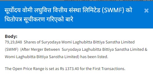काठमाडौं । नेपाल स्टक एक्सचेञ्जमा सूर्योदय वोमी लघुवित्त वित्तीय संस्था लिमिटेडको शेयर सूचिकृत भएको छ । नेप्सेमा सूर्योदय लघुवित्त वित्तीय संस्था लिमिटेड र वोमी लघुवित्त वित्तीय संस्था लिमिटेड एक आपसमा मर्जर हुँदा कायम हुन आएको ७९ लाख १९ हजार ८ सय ४८ कित्ता शेयर धितोपत्र सूचिकरण विनियमावली, २०७५ बमोजिम नेप्सेमा कारोबार हुन सक्ने गरी सूचिकृत भएको हो ।