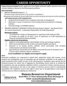 सृजना फाइनान्स लिमिटेडले कर्मचारी माग गरेको छ । फाईनान्सले सप्तरी जिल्ला शाखाका लागि २ जना शाखा प्रबन्धक माग गरेको छ । यसैगरि मोरङ, सुनसरी र सप्तरी जिल्लाका लागि फाइनान्सले केहि संख्यामा ट्रेनी एसिस्टेन्ट माग गरेको छ । शाखा प्रबन्धकका लागि शैक्षिक योग्यता स्नातक वा स्नाकोत्तर उत्तीर्ण गरेको हुनु पर्ने फाइनान्सले जनाएको छ । शाखा प्रबन्धक पदका २ देखि ३ वर्षको कार्याअनुभव भएका व्यक्तिले आवेदन दिन सक्नेछन् । व्यवश्थापन संकायमा प्लस टु वा स्नातक तह उत्तीर्ण गरेका व्यक्तिले ट्रेनी एसिस्टेन्ट पदमा आवेदन दिन सक्नेछन् ।