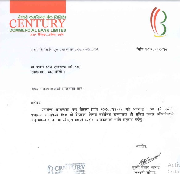 काठमाडौं । सेञ्चुरी कमर्सियल बैंकको सञ्चालक सुनिल कुमार न्यौपानेले राजिनामा दिएका छन् । बैंकको गत चैत १५ गते बसेको सञ्चालक समितिको बैठकले न्यौपानेले दिएको राजिनामा स्वीकृत गरेको हो ।