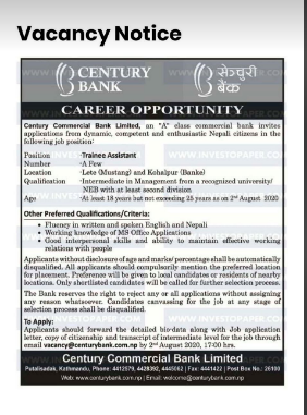 काठमाडौं । सेञ्चुरी कमर्सियल बैंकले विभिन्न पदका लागि कर्मचारीको माग गरेको छ । बैंकले ट्रेनी असिस्टेन्टका लागि केही संख्यामा कर्मचारीको माग गरेको छ । बैंकले आफ्नो विभिन्न शाखा कार्यालयका लागि कर्मचारीको माग गरिएको जनाएको छ ।