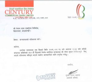 काठमाडौं । सेञ्चुरी कमर्सियल बैंक लिमिटेडले सञ्चालक रमेश कुमार निरौलाको राजिनामा स्वीकृत गरेको छ ।