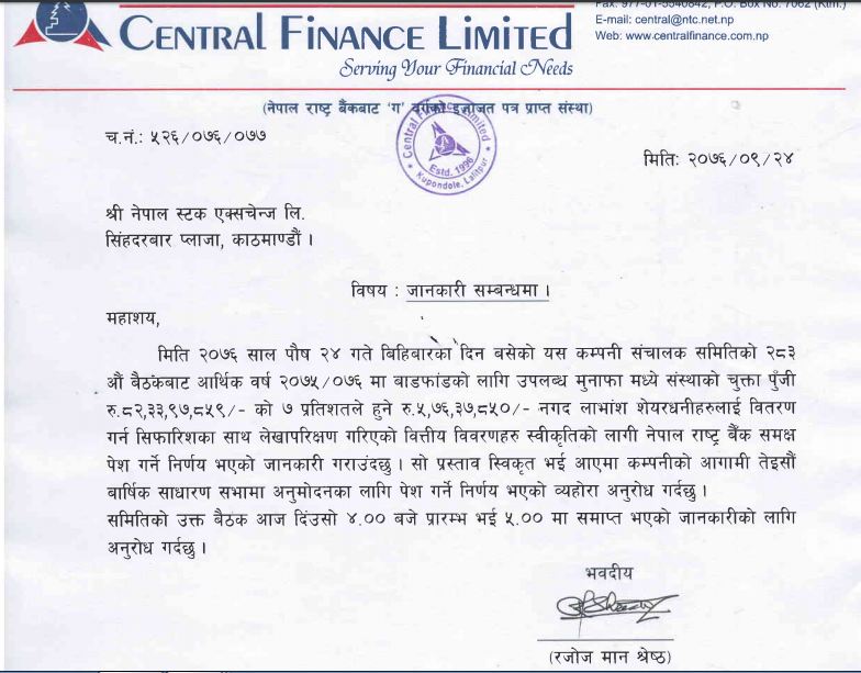 काठमाडौं । सेन्ट्रल फाइनान्सले ७ प्रतिशत लाभांश दिने घोषणा गरेको छ । कम्पनीको बिहीबार बसेको सञ्चालक समिति बैठकले आर्थिक वर्ष २०७५/७६ को नाफाबाट ७ प्रतिशत नगद लाभांश वितरण गर्ने निर्णय गरेको हो ।