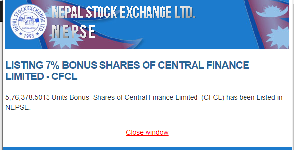काठमाडौं । नेप्सेमा आज सेन्ट्रल फाइनान्सको ७ प्रतिशत बोनश शेयर सुचिकृत भएको छ । कम्पनीको ७ प्रतिशत बोनश वापत ५ लाख ७६ हजार ३७८ दशमलव ५० कित्ता बोनश शेयर सुचिकृत भएको हो ।