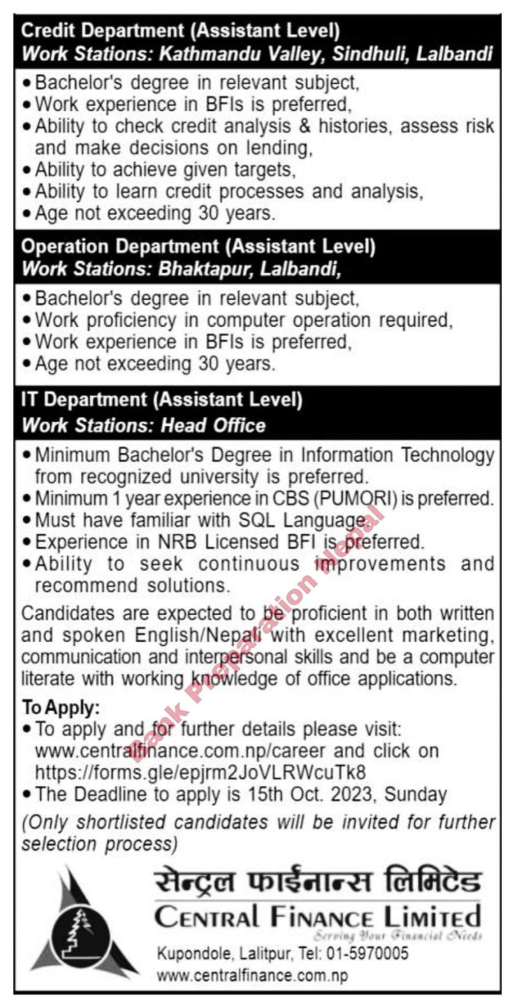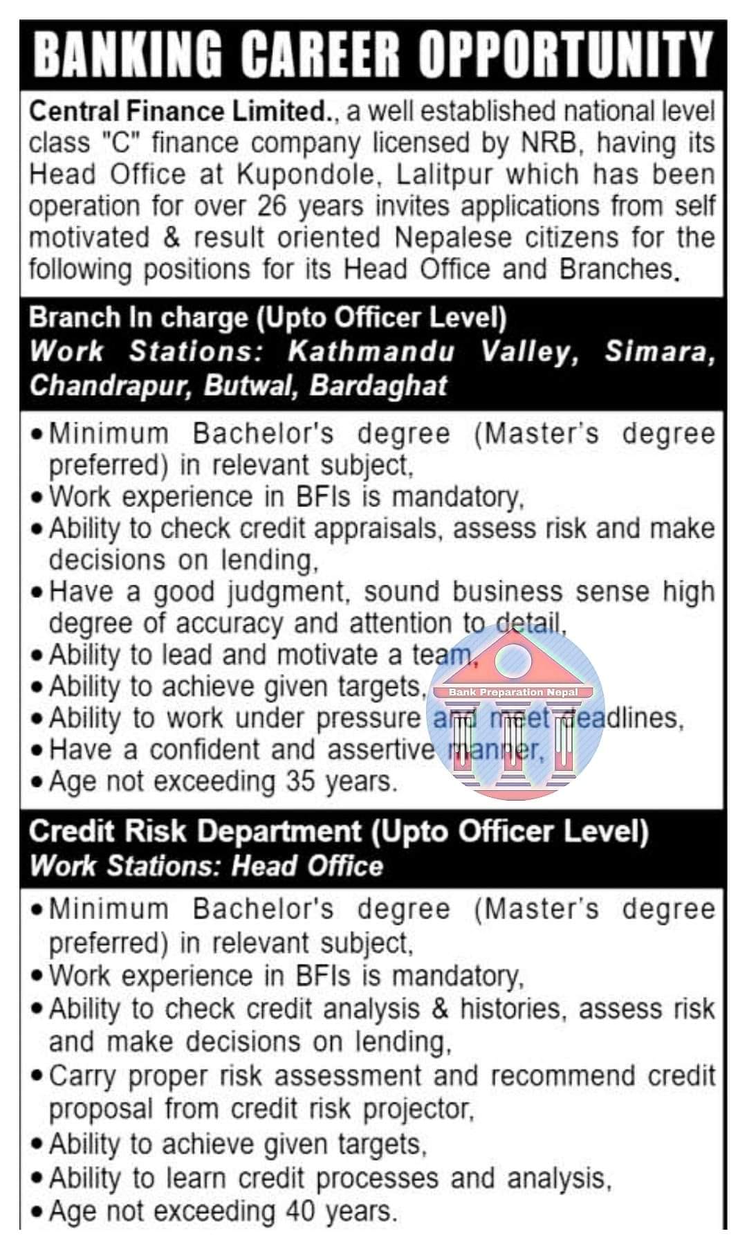 सेन्ट्रल फाइनान्सले माग गर्यो धेरै पदका लागि कर्मचारी