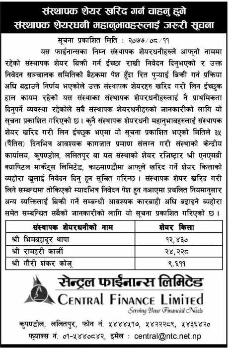 नेपाल राष्ट्र बैंकको निर्देशन बमोजिम सर्वप्रथम फाईनान्सका संस्थापक शेयरधनीहरुलाई नै प्राथमिकता दिनुपर्ने भएकाले संस्थापक शेयर खरिद गर्न इच्छुक संस्थापक शेयरधनीहरुलाई सूचना प्रकाशन भएको मितिले ३५ दिनभित्र आवश्यक कागजपत्र संकलन गरेर संस्थाको केन्द्रीय कार्यालय, कुपण्डोल, ललितपुर वा फाईनान्सको शेयर रजिष्टार एनएमबि क्यापिटलमा आइपुग्ने गरि निवेदन दिन कम्पनीले भनेको छ ।