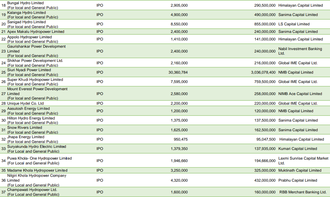 धितोपत्र बोर्डमा बुंगल हाइड्रो, कलंगा हाइड्रो, सानीगढ हाइड्रो, एपेक्स मकालु हाइड्रोपावर, एप्पलो हाइड्रोपावर, गौरीशंकर पावर डेभलपमेन्ट, शिखर पावर डेभलपमेन्ट, सुरी न्यादी पावर सुपर खुदी हाइड्रोपावर र माउन्ट एभरेस्ट पावरले आइपीओ ल्याउन अनुमति मागेका छन्।