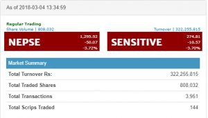 नेपाल स्टक एक्सचेन्ज (नेप्से) परिसूचक ४१.५६ अंकले ओरालो लाग्यो । अर्थमन्त्री डा युवराज खतिवडाले सेयर बजारलाई अनुत्पादक भनेको आधारमा सेयर बजार घटेको बताइएको छ ।