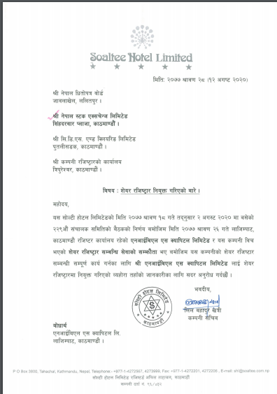 कम्पनीको शेयर रजिष्टारसम्बन्धी सम्पूर्ण काम एनआईबिएल एस क्यापिटलले गर्ने होटलले जनाएको छ ।