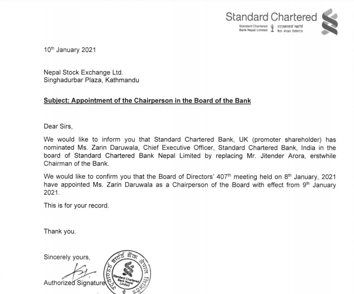 स्टाण्डर्ड चार्टर्ड बैंक नेपालका अध्यक्ष जितेन्दर अरोराको ठाउँमा जेरिन डरुवालले नयाँ अध्यक्षको रुपमा नियुक्त गरिएको स्टाण्डर्ड चार्टर्ड बैंकले जनाएको छ । बैंकले गत जनवरी ८ मा सम्पन्न भएको बोर्ड बैठकले जनवरी ९ देखि लागू हुने गरी दरुवाललाई नयाँ अध्यक्षमा नियुक्त गरिएको जनाएको हो ।