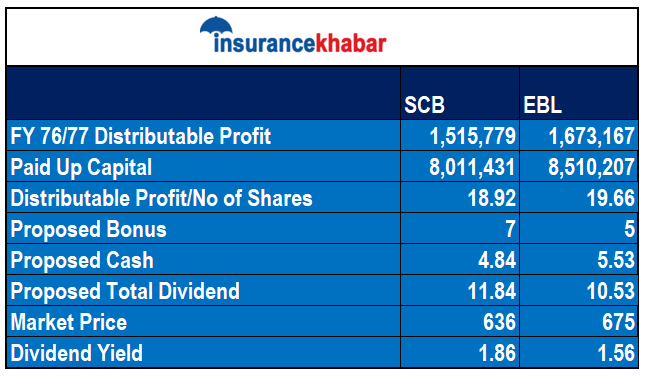 अरु वाणिज्य बैंकहरुले आर्थिक वर्ष ७६/७७ को वितरणयोग्य मुनाफा भन्दा पनि धेरै लाभांश प्रस्ताव गरेको बेलामा दुई बैंकले भने निकै कम लाभांश प्रस्ताव गरेका छन्।